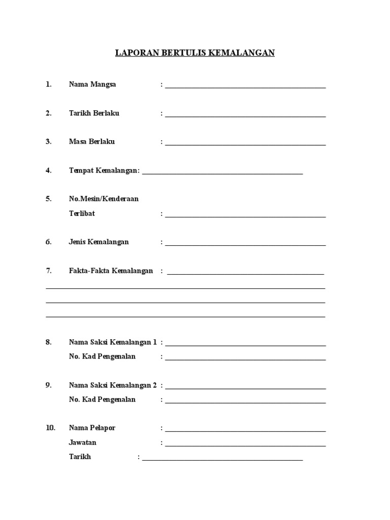 Buku ini secara khusus membahas. Format Laporan Kes Kemalangan Murid Laporan Kemalangan Di Kawasan Sekolah Laporan Awal Kes. Keracunan atau Penyakit Pekerjaan i Jika seseorang yang mengidap atau mungkin mengidap keracunan pekerjaan atau penyakit pekerjaan UKKP hendaklah menghantar laporan kemalangan kepada DOSH.