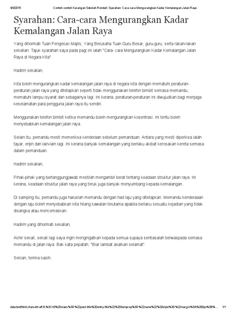 Contoh Contoh Karangan Sekolah Rendah Syarahan Cara Cara Mengurangkan Kadar Kemalangan Jalan Raya